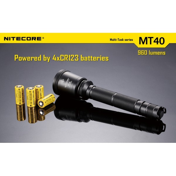 Svetilko Nitecore Mt40 napajajo 4XCR123A litijeve baterije katere lahko ob pogostejši uporabi in za večjo ekonomičnost zamenjate z 2x 18650 Li-Ion polnilnimi akumulatorji. CREE XM-L2 T6 LED dioda je predstavnica zadnje generacije LED diod ter zagotavlja 50.000h življenjske dobe.